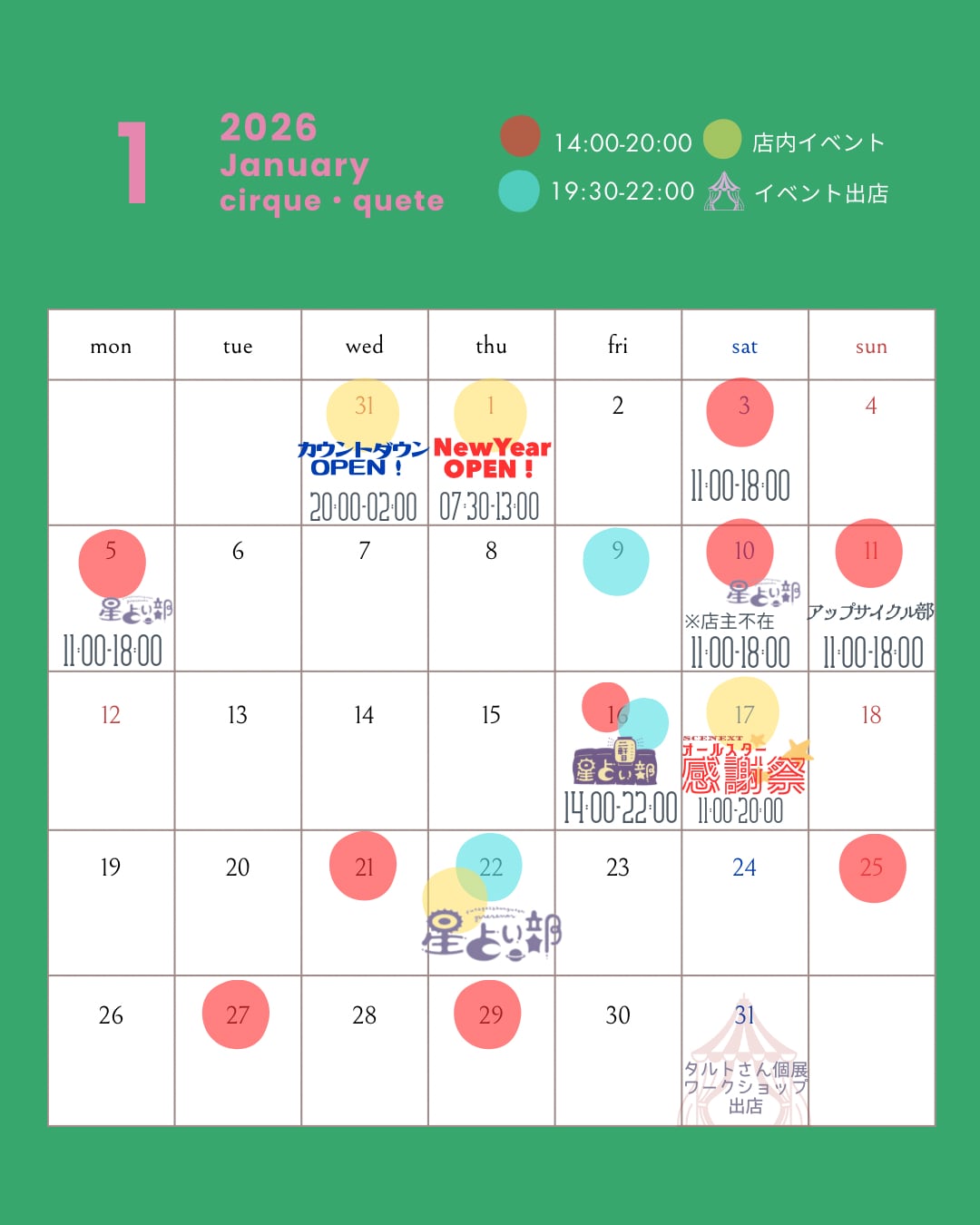1月のオープン&イベント情報です🎪